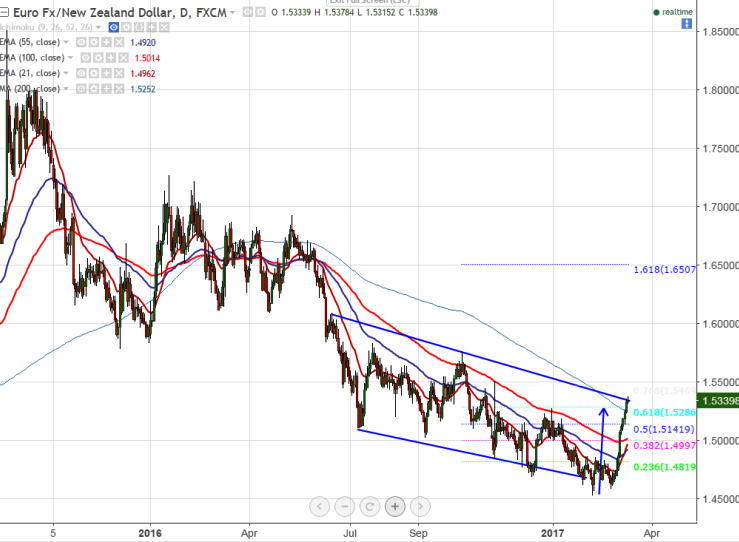 - EUR/NZD has shown a slight decline after breaking the trend line resistance of 1.5350 levels. It is currently trading around 1.53390.