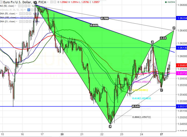 - The pair has jumped slightly above 1.0600 level after forming a bottom around 1.04938 on Feb 22nd 2017. It is currently trading around 1.05800.