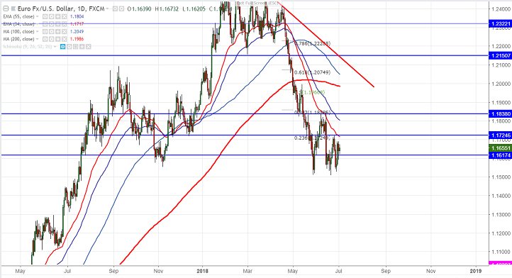 - EUR/USD has shown a minor recovery after better than expected Euro zone data.Eurozone PPI year-over-year came at 1 year high. Industrial inflation came at 3% year-over-year compared to 1.9% increase in the month of Apr. Eurozone retail sales came subdueded on account of rise in energy costs. EU migration deal in European summit has stabilized German government. The pair hits intraday high of 1.16732 and is currently trading around 1.16516.