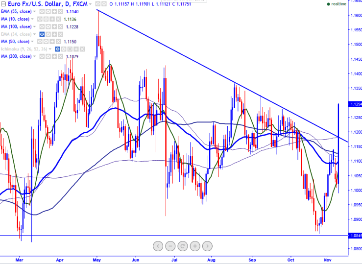 - EUR/USD breaks major trend line resistance at 1.1200 and jumped till 1.12835 on account of Trump leading the US presidential election.It is currently trading around 1.1278.