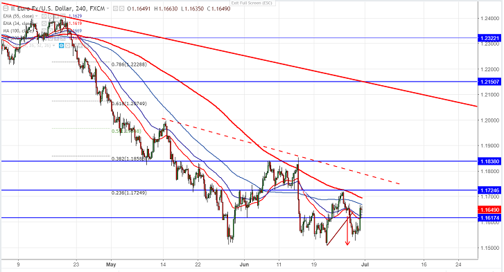 - EUR/USD has shown a huge jump of more than 100 pips for the day due to late night EU migration deal in European summit has stabilized German government. The pair hits high of 1.1660 and shown a minor decline. It is currently trading around 1.16357.