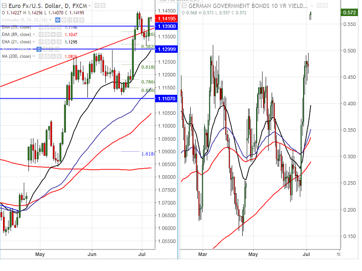 - German Bund yield crossed 0.5% for the first time since Jan 2016 and closed at 0.56%. German Bund and Euro have positive correlation. So jump in yield confirms minor jump in euro till 1.1500.