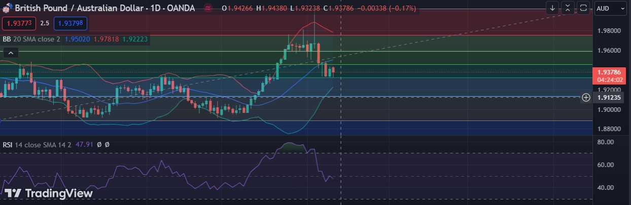 • Strong support is seen at 1.9310 (50%fib) and break below could take the pair towards 1.9227(Lower BB).