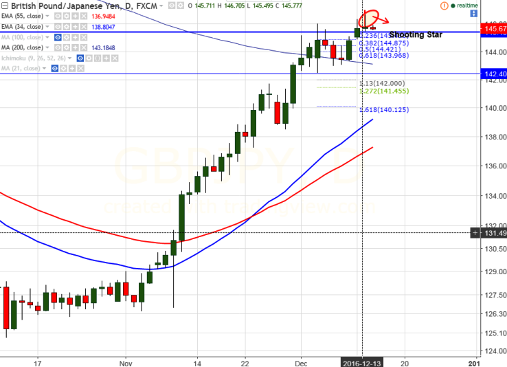 - The pair has formed shooting star candlestick pattern in the daily chart .GBP/JPY jumped till 146.70 and started to decline from that level. It is currently trading around 145.58