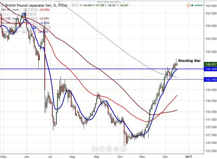 - The pair has formed shooting star candlestick pattern in the daily chart .GBP/JPY jumped till 148.45 and started to decline sharply from that level. It is currently trading around 146.82.