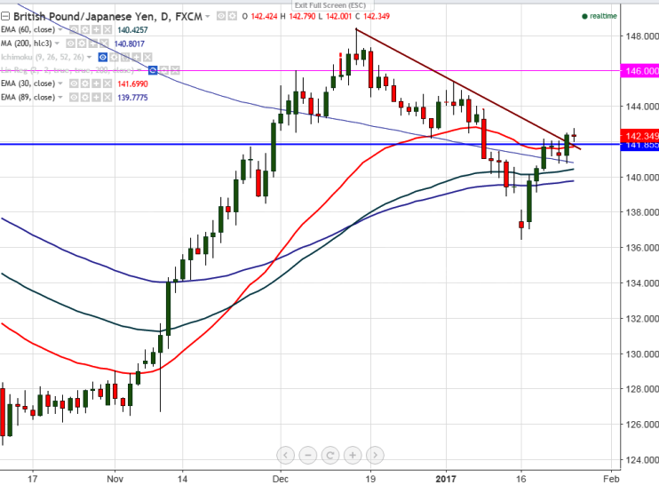 - GBP/JPY broken the trend line resistance and jumped till 142.79 yesterday. It is currently trading around 142.35.