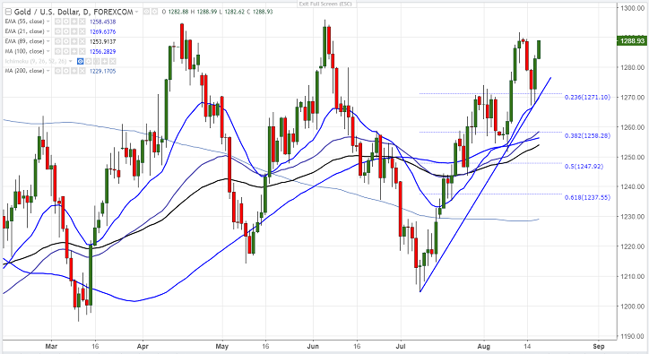 - Gold recovered almost 1.5% yesterday on weaker U.S dollar and Fed minutes meeting. The yellow metal jumped almost $20 from the yesterday low and is currently trading around $1287.97.