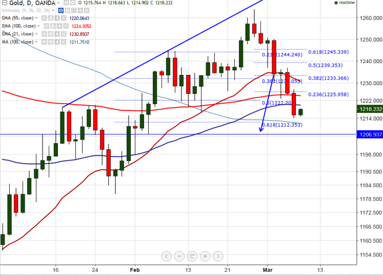 - The yellow metal hits one month low yesterday on account of increasing Fed rate hike hopes. Gold trades slightly below 100- day EMA and it should break below 61.8% for further weakness. It is currently trading around $1217.50.