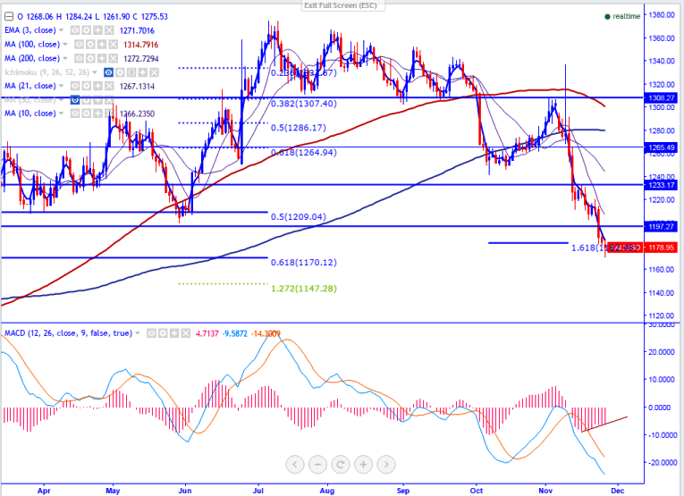 - The yellow metal‘s upside is capped by 3- day EMA ($1192) and any break above targets $1200/$1212 (10- day MA). The bullish divergence pattern formed in daily chart shows that there will be slight jump till $1192/$1200. The slight jump should be used as the opportunity for selling.