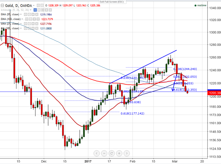 - Gold has broken major support at 100- day EMA around $1212 and declined till $1205.76. It is currently trading around $1205.50.