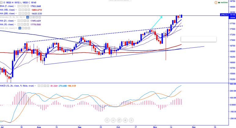 •Nikkei225 continues its up trend move and broken the high of 18107 made on 17th Nov 2016 on account of weaker yen and is currently trading at 18152 0.68% higher.