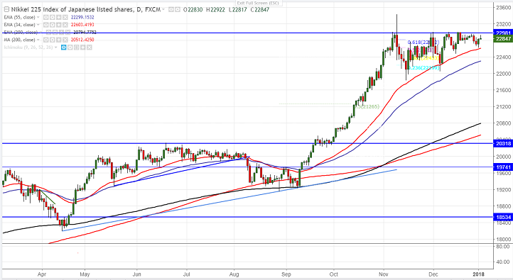 - Nikkei has shown a minor jump till 22922 after long weekend. The US stock markets starts year on strong note and NASDAQ closed above 7000 for the first time. But slightly higher capping the gains of Nikkei.The index hits low of 22619 and is currently trading around 22850.01% higher.