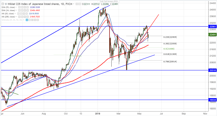 - Asian markets are trading slightly weak on fresh geopolitical uncertainty.President Trump cancelled a June meeting with North Korean leader Kim Jong Un. Dow Jones recovered almost more than 250 points from low. US futures is trading marginally positive with Dow Jones at 24876 (0.28% higher) and S&P500 2734 (0.30% higher). It is currently trading around 22455 0.49% higher.