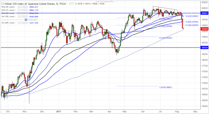 - Nikkei has declined almost 2% yesterday on account of global equities sell off and stronger yen.The index broken major support of 19635 (100-day MA) and declined till 19308 at the time of writing. The index has made a temporary top at 20319 on Jun 20th 2017 and any further bullish continuation only above that level. It is currently trading around 19349 0.11% lower.