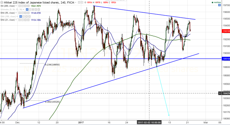 Nikkei has lost its continued winning streak after jumping till 19478 yesterday. The index is facing strong resistance at 19566 and any further bullishness can be seen only above that level. It is currently trading at 19348 0.4% higher.