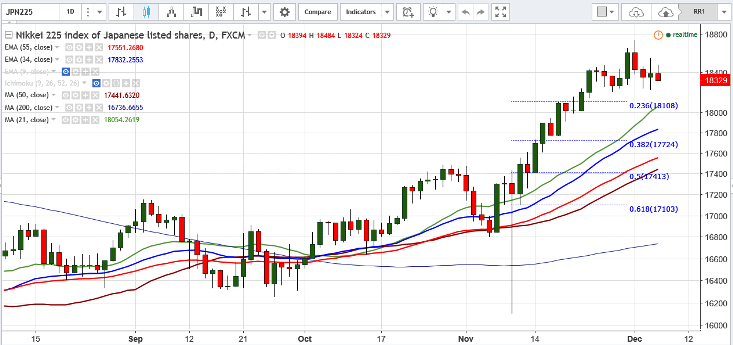 Nikkei225 has slightly recovered after making a low of 18224 .The index declined from the high of 18742 after PM resigns on a clear referendum defeat. It is currently trading at 18344 0.26% lower.
