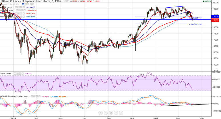 - Nikkei broken the major support 18638 low formed on Jan 18th 2017 and declined till 18548 at the time of writing on account of strong JPY. It is currently trading at 18608 at 0.17% lower.