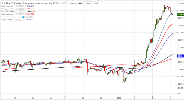 - Nikkei breaks 2017 high at 23423 and hits high of 23674 yesterday. The index was trading above 2017 high . The major reason for jump in index was mainly due to slight weakness in yen and strong global stock markets. US Dow Jones rose 152.45 up 0.61% to 25075 first time on Thrusday on account of better than expected US ADP jobs data and strong oil price.It is currently trading around 23549 0.38% lower.