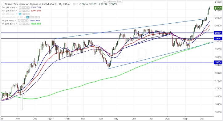 - Nikkei trading extremely bullish and has closed above 21000 for the first time since 1996 on strong global equities and positive earnings by retailers. The index has broken the high of 21261 made yesterday and jumped till 21351.Nikkei has formed a temporary bottom around 20200 and is currently trading around 21301 0.31% higher.