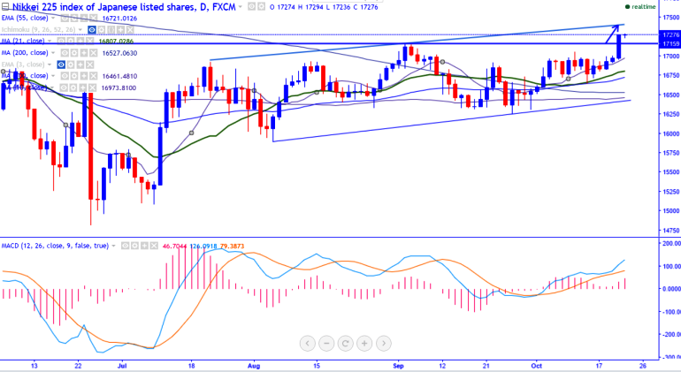 - Nikkei225 rises to fresh six month high today morning on account of higher US stocks and weaker yen. The index has broken the high made on Sep 2nd 2016 and jumped till 17285 yesterday.It is currently trading around 17289.
