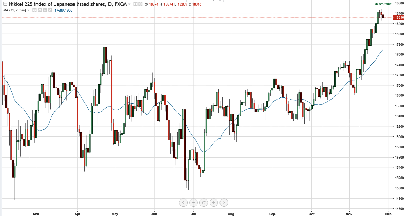•Nikkei225 has made a top of 18482 and slightly declined from that level. It is currently trading at 18290 0.45% lower.