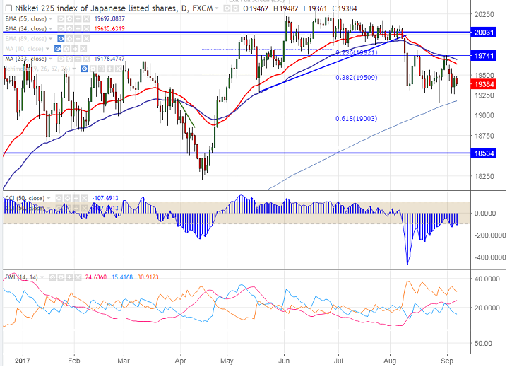 - The upside is limited due to rising geo political tensions in North Korea. North Korea is expected to launch another intercontinental ballistic missile towards its west coast by end of week. The demand for safe haven assets such as Gold, Swiss franc and yen increased due to this uncertainties. Nikkei is currently trading around 19382 0.41% lower.