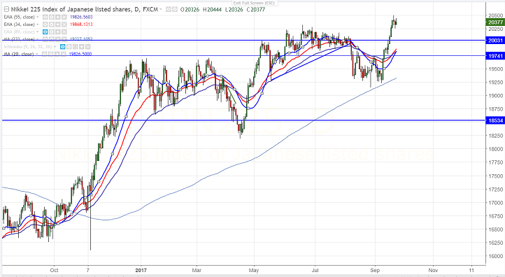 - Nikkei has jumped slightly on weak yen and snap election hopes. The pair jumped after hitting low of at the time of writing and is trading around 20380 0.27% higher.