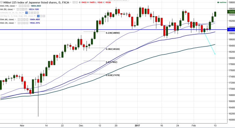 Nikkei broken the high made on Feb 10th 2017 at 19458 and jumped till 19518 at the time of writing on account of weaker yen. Nikkei should break below 60- day EMA for minor trend reversal.It is currently trading at 19503 0.78% higher.