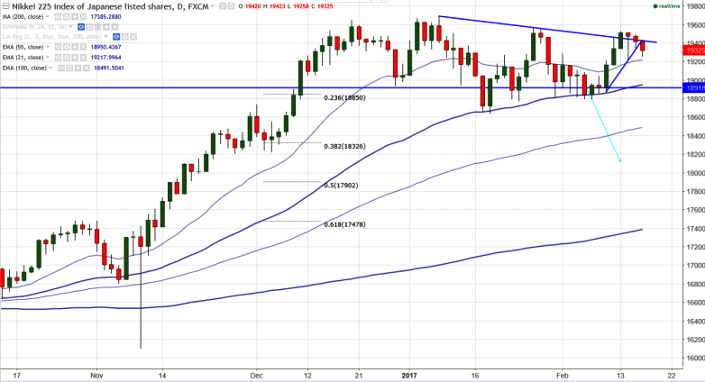 Nikkei has declined mildly after jumping till 19495 yesterday. Nikkei is facing strong support at 21- day EMA and any minor weakness can be seen only below that level.It is currently trading at 19328 0.48% lower.