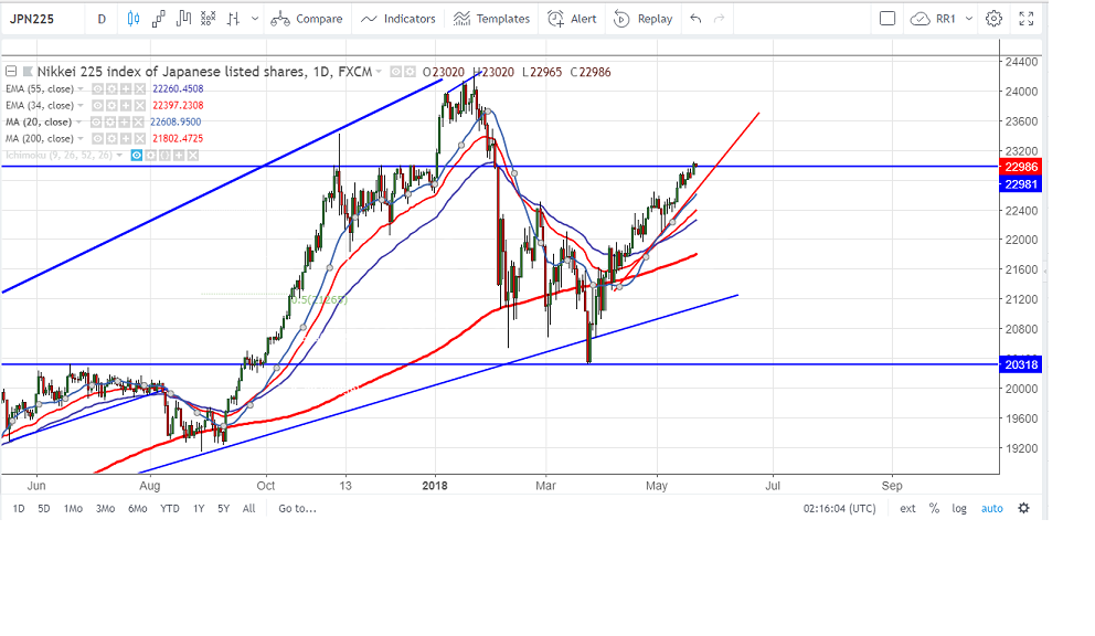 - Asian markets are trading slightly weak after a good jump in US markets yesterday. Dow Jones jumped almost 300 points and closed above 25000 for the first time since mid- March as trade war between US- China temporarily eased. Trade tension has been reduced after US Treasuty Secretary Steven Mnuchin said the U.S will suspend tariffs of $150 billion on Chinese imports. US futures is trading marginally positive with Dow Jones at 24943 (0.40% higher) and S&P500 2737 (0.31% higher). It is currently trading around 22804 0.46% higher.
