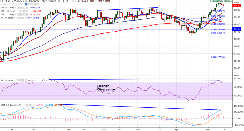 - In daily chart Nikkei has formed bearish divergence in RSI and MACD , a slight decline till 19500/19300 likely.