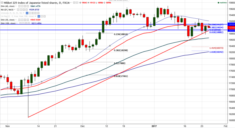 Nikkei225 shown a slight jump above 19000 but not able to hold at higher levels. The index shown a slight jump till 19133 at the time of writing.It is currently trading around 18998 0.23% lower.