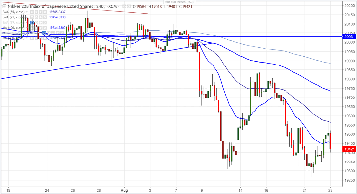 - Nikkei has shown a slight recovery after showing a minor decline below 200- day MA . The index has shown a minor pullback form the low on account of slight jump in global equities and minor decline in strong yen. The index has jumped till 19560 and is currently trading around 19421 0.38% lower.