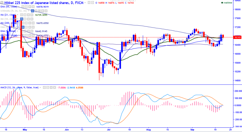 - Nikkei225 reached high of 16918 yesterday and a small amount profit booking started from that level on account of higher yen. It is currently trading around 16726.