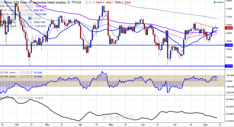 - Nikkei225 has slightly retreated after making a high of 16814 yesterday. It is currently trading around 16639.