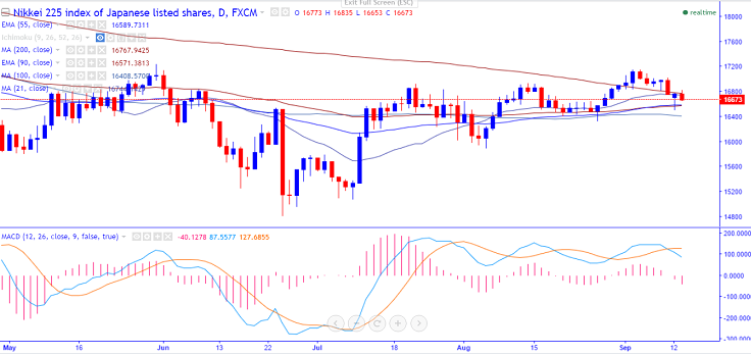 - Nikkei225 has recovered after making a low of 16506.It is currently trading around 16673.