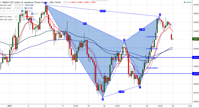 Nikkei225 declined sharply after showing a minor jump above 19500 level. It is currently trading around 19306 0.85% lower.