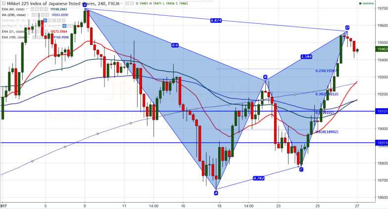 Nikkei225 jumped slightly above 19500 level and reached till 19566 yesterday. It is currently trading around 19458 0.27% lower.
