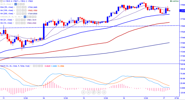 •The index immediate support is at 17645 (100- H MA) and any break below will drag the index down till 17500/17360 (200- H MA)/16800 in the short term.