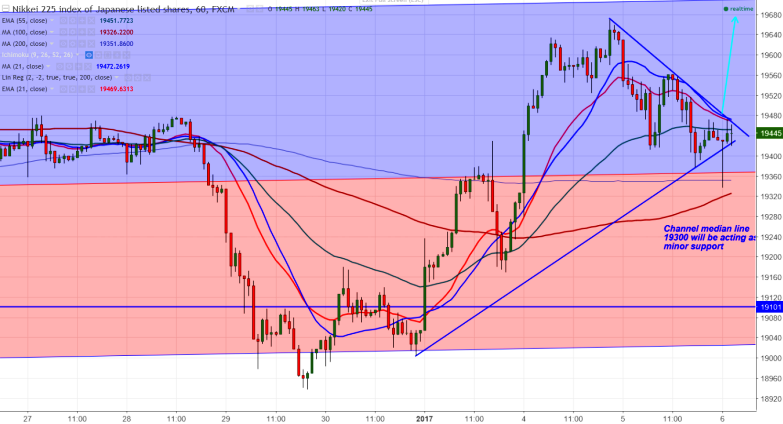 Nikkei225 has once again retreated after jumping till 19563.The slight recovery in yen has dragged the price down till 19338. It is currently trading around 19438 0.03% higher.