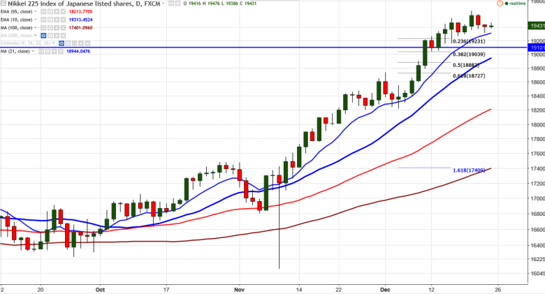 Nikkei225 is trading in very narrow range between 19446 and 19316 for the past three trading session. It is currently trading around 19409 -0.09% lower.
