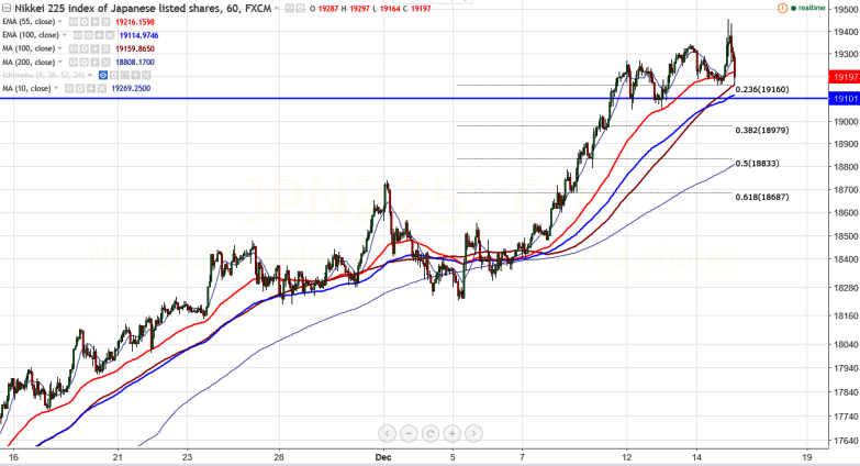 - Nikkei225 declines drastically after making a high of 19457 on account of first 25bpbs rate hike by Fed .It is currently trading around 19167 1.1% lower.