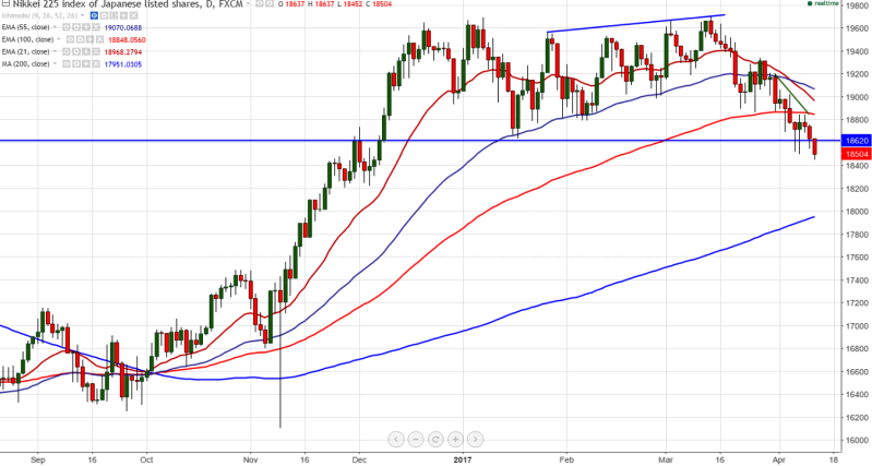 - Nikkei trades weak on account of stronger yen.The Japanese yen spiked to highest level since Nov 2016 due to uncertainty in Syria and North Korea.The index declined sharply after a slight jump till 18847.It's major support is around 18500 and any break below confirms further weakness.