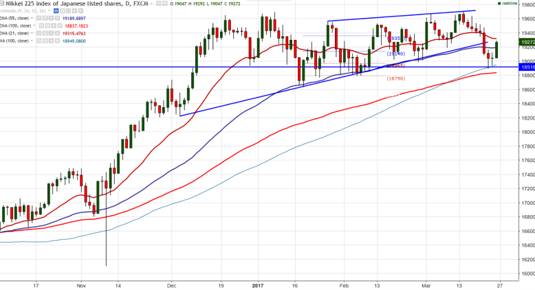 - Nikkei has taken support near 100- day EMA and jumped sharply from that level. It is currently trading at 19273 1.21% higher.