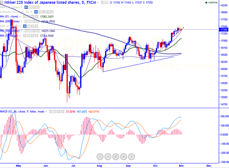 - Nikkei225 trades slightly higher compared all other Asian indices on the account of weaker yen.It is currently trading around 17402.