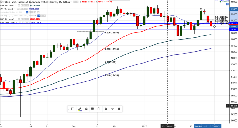Nikkei225 continue its loosing streak and broken the major support at 21- day MA. The index declined till 19051 at the time of writing. It is currently trading around 19073 0.55% lower.