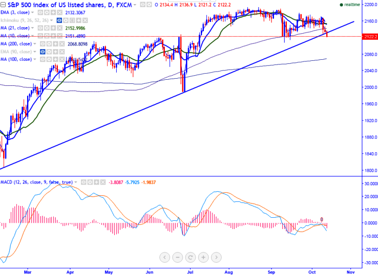 - The index breaks trend line support and declined till 2120 at the time of writing. It is currently trading around 2125.