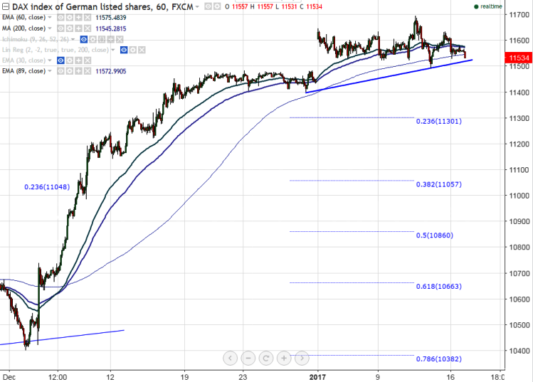 - DAX formed temporary top around 11695 on Jan 11th 2017 and showing a minor profit booking from that level. The index is currently trading around 11535.