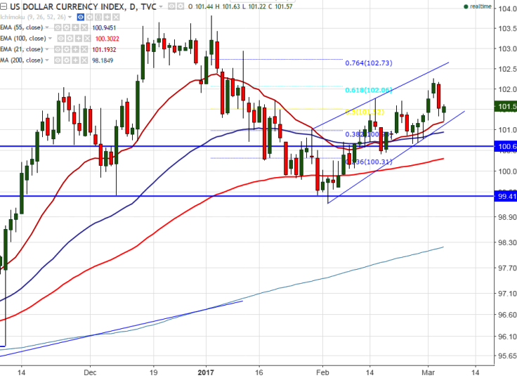- On the higher side, next immediate resistance is around 101.87 (61.8% retracement of 102.26 and 101.22) and any break above will take the index till 102.30/102.95 (Jan 1st 2017 high).