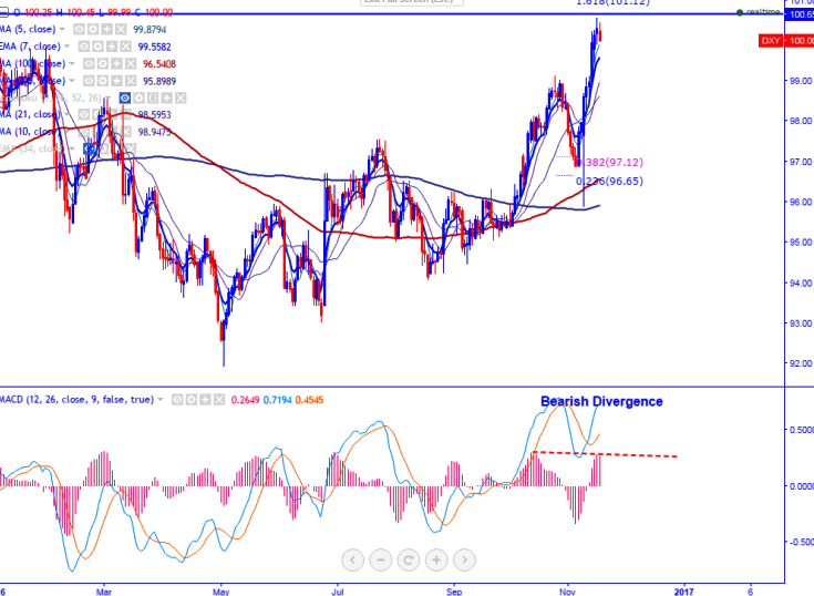 - In the daily chart the index has formed bearish divergence, so a slight decline till 98.66 (10- day MA)/98 is possible.